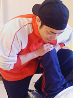 戻ってきた先生は、真っ赤なジャパーに黒キャップで登場!