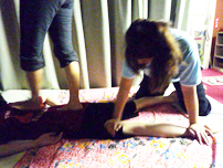 うつ伏せになり、いよいよマッサージ開始!ふくらはぎ、太ももと上へ上へと押し揉み。