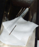 手から腕を軽く触ってるなぁ〜と思いきや、一本目の細〜い鍼が手首にスゥーと入っいく。刺したままではなく、そのまま抜かれる。両手首足首にも同じようにさされていく。