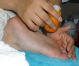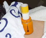 うつ伏せになり、胸、お腹、脚、腕・・・細かく細かくやさしくマッサージしながら、悪い箇所を探索していくように触診していく。「ココは!」と思われる箇所に小さなお灸と鍼をおいていく。そして、何やらオレンジ色の筒状のものが登場!?