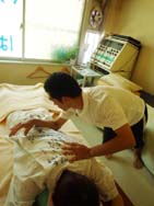 甚平を前後ろにして、いよいよ鍼灸へ。