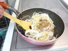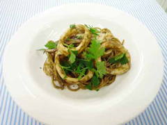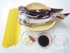 | 【4】 | フライパンにオリーブ油を熱し、にんにくと唐辛子を弱火で炒め、良い香りがたったら、 切ったイカを加えてさっと火を通し、ゆであげたスパゲッティを加え、 さらに【3】のワタのソースを加えて炒め合わせます。刻んだパセリを散らします。 |