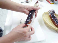 | 【2】 | ヤリイカは軟骨とワタを除き、皮をむきます。胴は輪切りにし、足は食べやすく切ります。 |