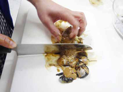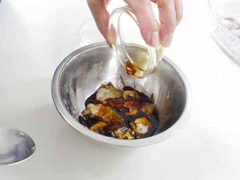 | 【3】 | ワタをいかすみごと刻んでボウルに入れ、白ワイン・しょうゆ・塩・こしょうと混ぜ合わせます。 |
