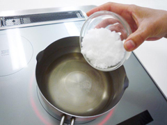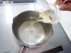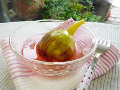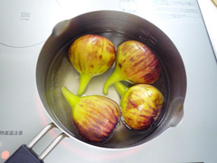 | 【2】 | 鍋に水、白ワイン、グラニュー糖を入れてひと煮したら、いちじくを加えます。 |