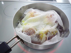 | 【3】 | キッチンペーパーで落としぶたをし、中火で15分煮ます。 |