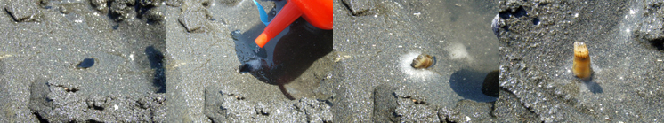 ここを逃すと、ほとんどの場合は、巣穴に引っ込んで、もう出てこなくなります。出てきたカラの部分をつかめたとしても、この貝、意外と強く抵抗しやがる。しかも、ここで無理矢理引っ張ると、中身が抜けてカラだけが手に残ってしまう。カラもキャシャで割れやすい。なんとも世話の焼ける貝です。そこで、相手の引っぱり具合と駆け引きをしながら少しずつ引き抜いていき、最後には、ズッポン!と。