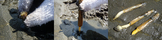 はじめて見る人は、そのビロ〜ンと伸びた身がキモイかも。でもこいつ、美味。慣れてくると、相手が油断したスキに一気に引き抜けるようになります。今回初めてマテガイ採りを経験した部員の感想=「これはクセになるなあ」。