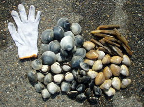 「自然」の潮干狩り場の面白いところは、貝の種類がバラエティーに富んでいるところ。今回の狩猟では他にカガミガイ、サルボウ(赤貝の仲間)なども採り、潮が満ちてきた13時頃に撤収!バケツ2杯強の貝を持ち帰り、いざCook&Eatです。