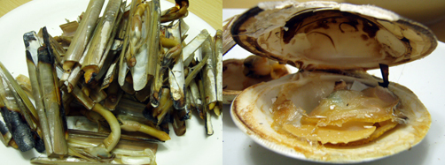 マテガイとホンビノスはシンプルに焼いた。ちょっと焼きすぎ?でも、味が濃厚で醤油などを垂らさずとも美味い!マテガイはフライやソテー、薫製にしてもウマイっす。ホンビノスは噛み切れないくらいに肉が「強い」。でも、「白ハマグリ」と名づけたくなるのがわかる旨味だね。