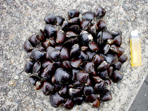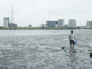 次なる獲物は、シジミです。「多摩川でシジミが復活」という話は2年ほど前から報告されていたようですが、私らは知らずに偶然出会いました。ある初夏の日、TOKYO狩猟部の一員と多摩川の下流を自転車で探索していたところ、干潮で現れた多摩川岸の干潟の上で、地元の人たちと思われるおじちゃんおばちゃんがしゃがんで何かを採っていた。アナジャコか?さっそく自転車を止めて干潟に降りていったのですが、そこで採っていたのがシジミでした。しかも、スーパーとかで売っているのと違って、大きいものは2.5cmくらいもある。色が茶色くてキレイだな。