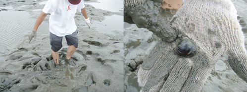 それと、TOKYO狩猟部が採った他の方法は、裸足での「グリグリ猟法」。これ、九十九里のハマグリ採りなんかでは良くやられてますが、裸足で泥の中をグリグリやってると足の裏にコロンと何かが当たる。で、手探りでシジミを拾い上げるというわけ。裸足なので、下にガラスとかあると恐いですが、私たちが行ったところではゴミも少なく、逆に、砂の中に貝殻がたくさん埋まっている海よりも安全という感じ。グリグリやらなくても、裸足で歩いているだけで、シジミがあればコロンと感じます。靴下だけ履いて歩くとケガもしにくくてよさげ。