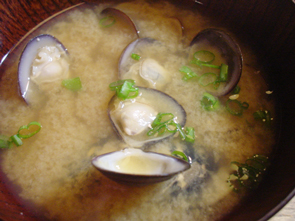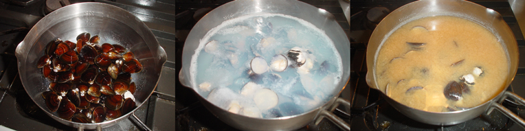 料理は、やはり味噌汁でしょ、ということで水に入れて煮立てていくと、水が白く濁ってアクが出てくる。アクを丁寧にすくい取りますが、この時点で、シジミ特有のかなりいい香りがしてきます。そこに味噌を溶かして、アサツキを散らすだけ。汁を飲むと、う〜ん、濃厚なシジミの香りがして美味い。「シジミの味噌汁」ファンが多いのも理解できます。