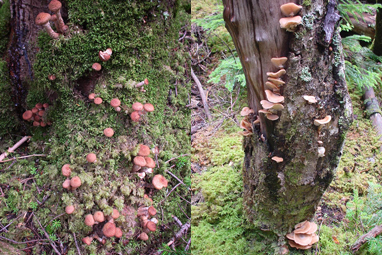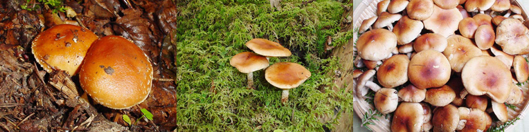 他のキノコがもう終わりかける晩秋に、いろいろなところで見かけ、標高の低めのところでも大量に発生しています。特徴の少ない地味系キノコなので前出の3種類に比べると同定が難しいですが、カサの縁の白っぽい鱗片、枝にある繊維状のささくれなどが特徴。雨で湿ると、カサにヌメリが出ます。毒菌のカキシメジと間違いやすいのでご注意を。