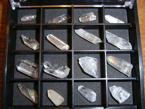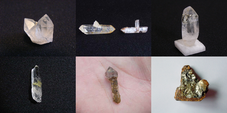 上段右は何か金属が入ってるもの。下段左は「草入り」。下段真ん中は珍品「松茸水晶」。時には下段右のような鉱物(黄鉄鉱?)も出てくる。