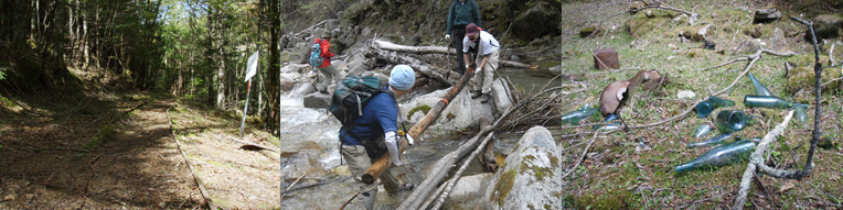 水晶鉱山跡は、そこそこの山奥にあることが多い。途中で橋のない渓流を渡ったり、ハッキリとした道がないところを進んでいったり。でも、子供連れで来てる人もいるし、学校の理科実習で来てる小学生たちもいます。途中の山道には、鉱山が繁栄していた当時のトロッコ跡や採掘職人たちの「宴の跡」なんかがあったりして、なかなか面白い。