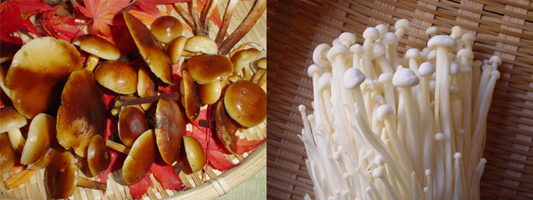 左が天然のエノキタケ。右はご存じ栽培エノキ。