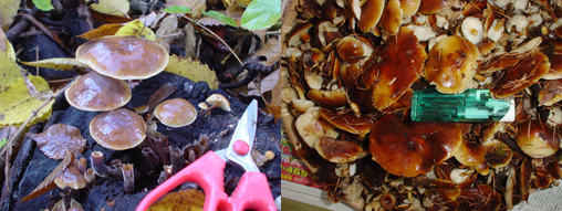 そして、もう一点、栽培モノと大きく違うのは、カサがでかく、柄も太いこと。当たり前っちゃあ当たり前ですが、「普通のキノコ」の形をしてます。大きいのになるとカサの直径は10cmに迫り、柄も1cm近い太さにまでなる。