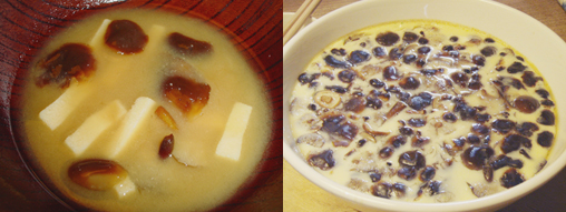定番料理として、味噌汁。旨いね〜。ナメコよりは野性味がソフト。ヌメリもほどよくて品がよろしい。そして、うちでよくやるのが、エノキオンリーの茶碗蒸し。これは絶品です!右の写真は、25cmくらいのどんぶりで作ったジャンボ茶碗蒸し。いくらでも食えますもんで。